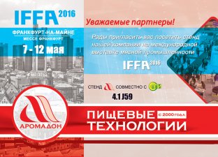 IFFA-2016 - крупнейшая выставка мясоперерабатывающей промышленности! С 7 по 12 мая 2016 года будет проходить во Франкфурте-на-Майне. Дорогие Друзья! Приглашаем посетить стенд "Аромадон" на крупнейшей международной выставке, по мясоперерабртке, IFFA-2016. Стенд "Аромадон" 4.1 J59