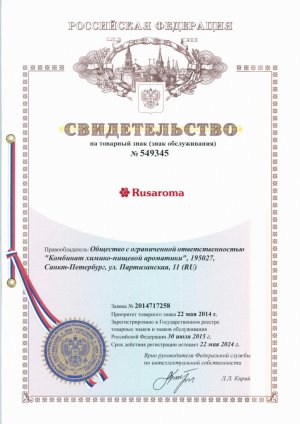 «Комбинат химико-пищевой ароматики» получил Свидетельство на товарный знак «Rusaroma».